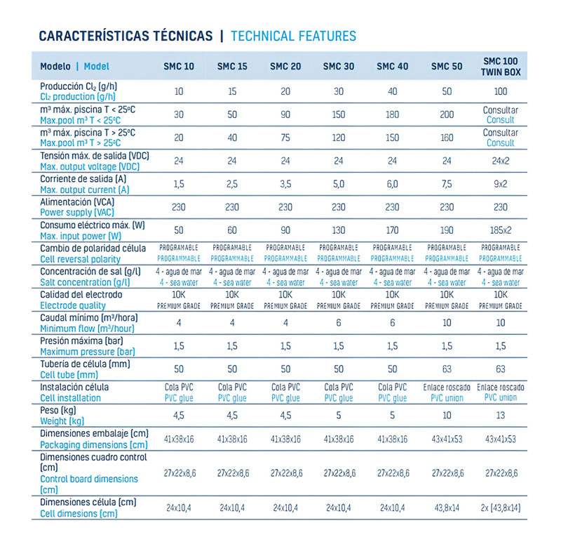 Máy điện phân nước muối SMC50 với công suất 50gr/h phù hợp với mô hình bể bơi gia đình từ 150-200m3. Sản phẩm clo hóa nước muối là một phương pháp đáng tin cậy, hiệu quả về chi phí, đặc biệt được chỉ định cho xử lý nước. thông qua một quá trình điện phân, clo (chất oxy hóa) được tạo ra tự nhiên, tránh phải xử lý, vận chuyển và lưu trữ hóa chất.